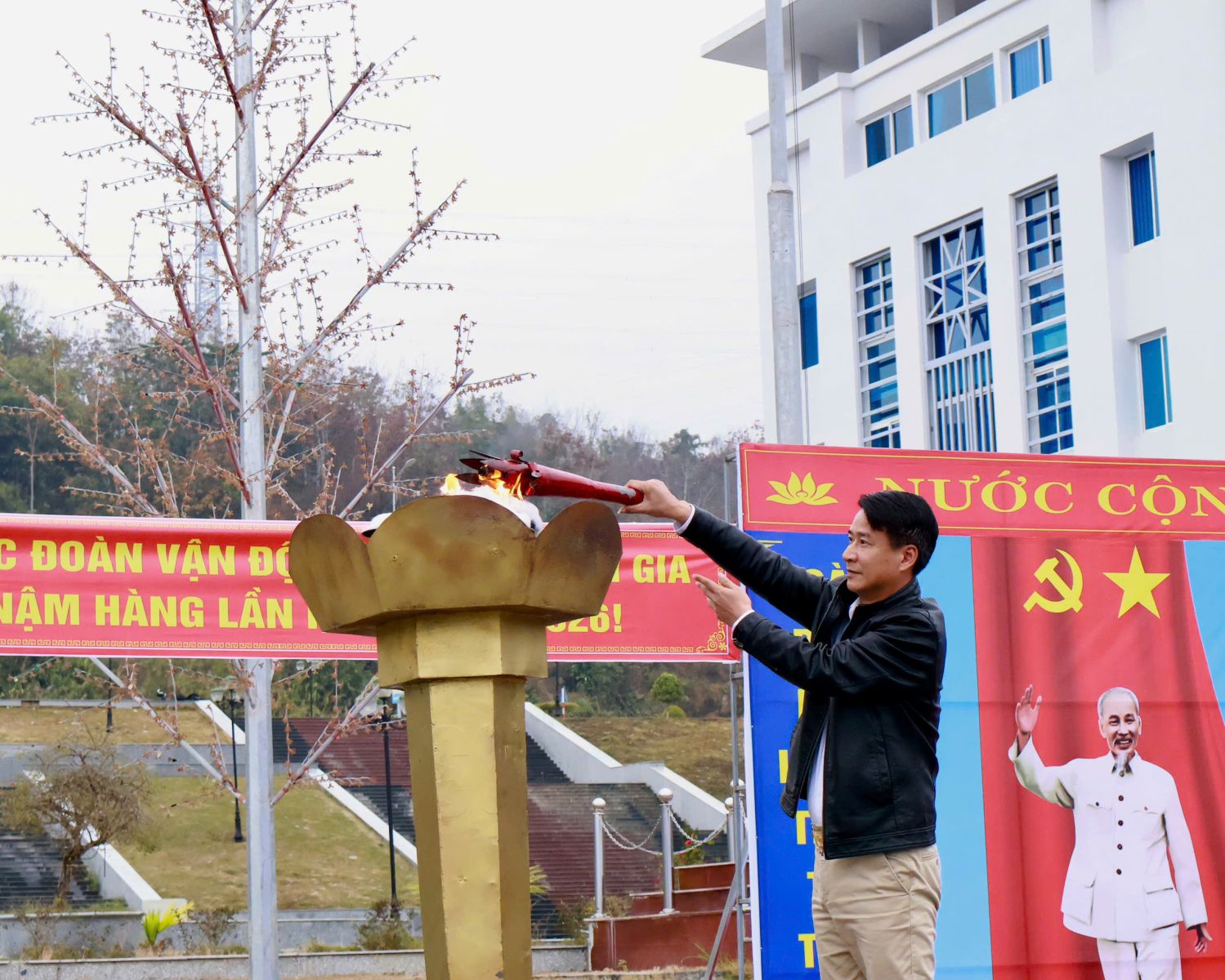 Đồng chí Quách Tất Hưởng - Phí Bí thư, Chủ tịch UBND xã Thắp lửa thiêng tại đài lửa HKPĐ xã